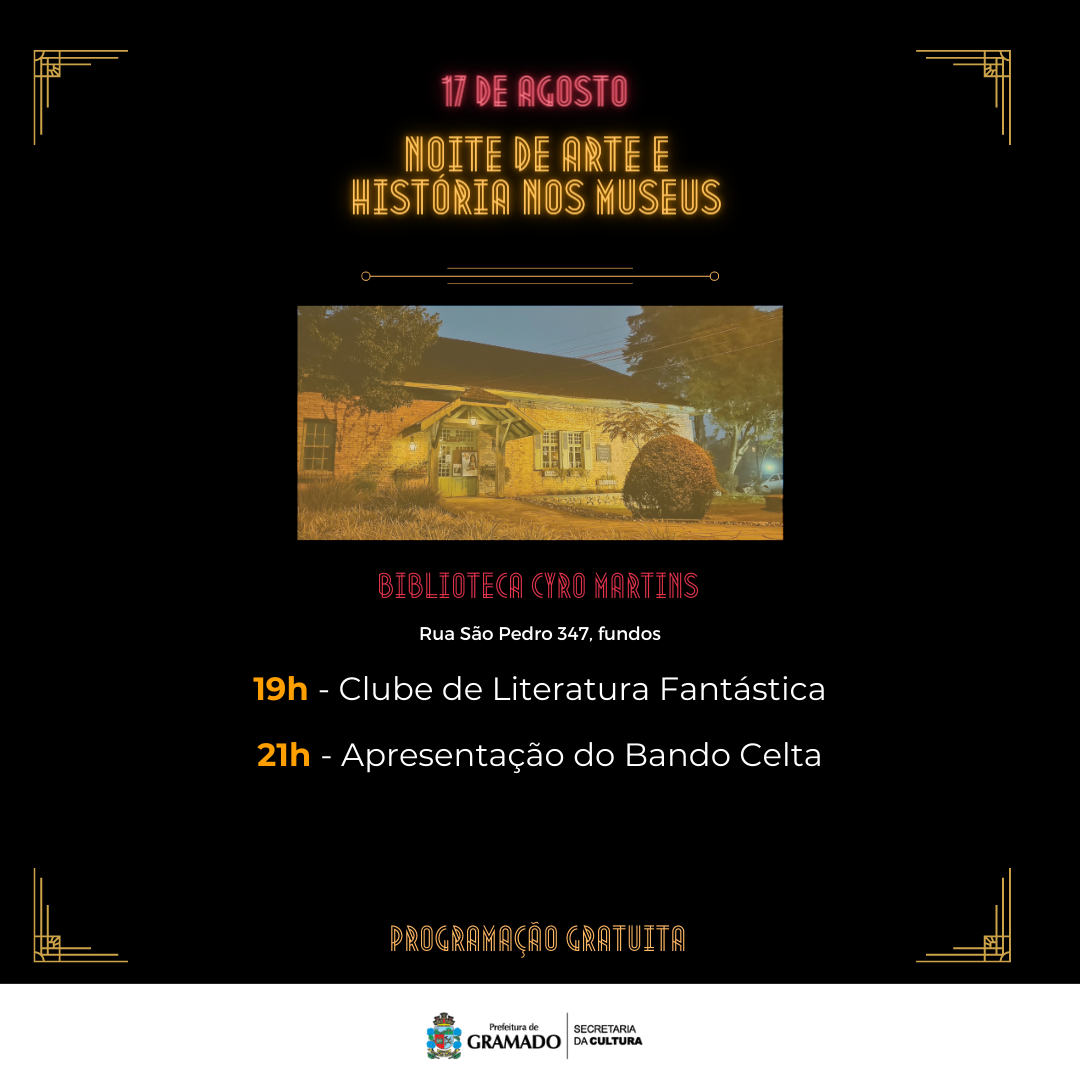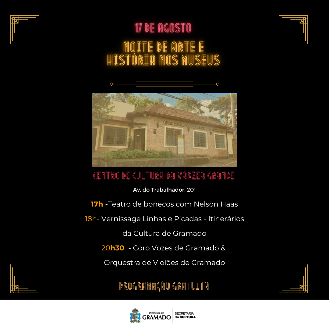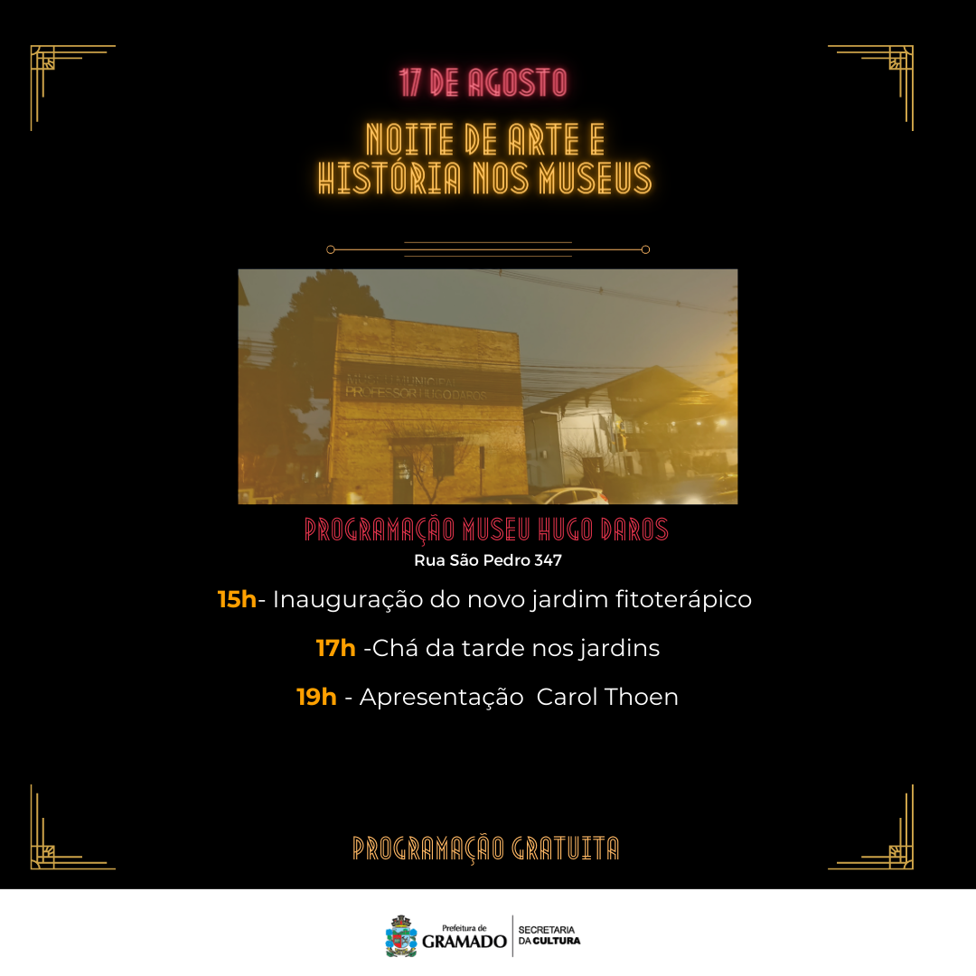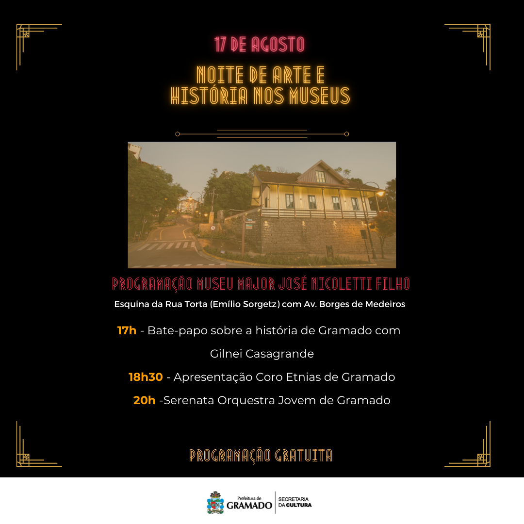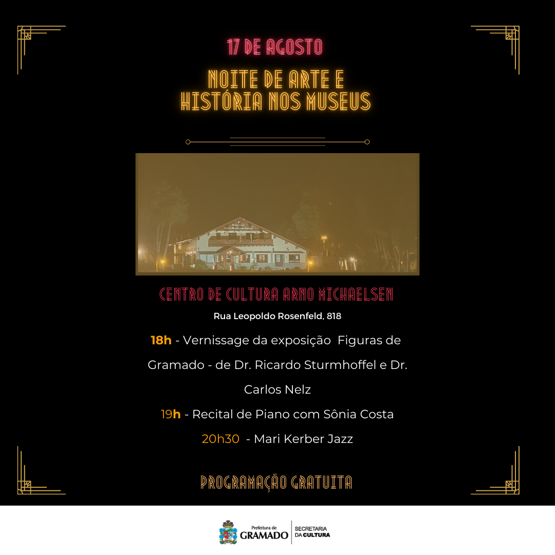 O Dia Nacional do Patrimônio Histórico, comemorado em 17 de agosto, será marcado por uma ação muito especial em Gramado: a primeira edição da Noite de Arte e História nos Museus. Nesta data, cinco espaços patrimoniais do município vão receber atrações artísticas e culturais até às 22 horas da noite.
