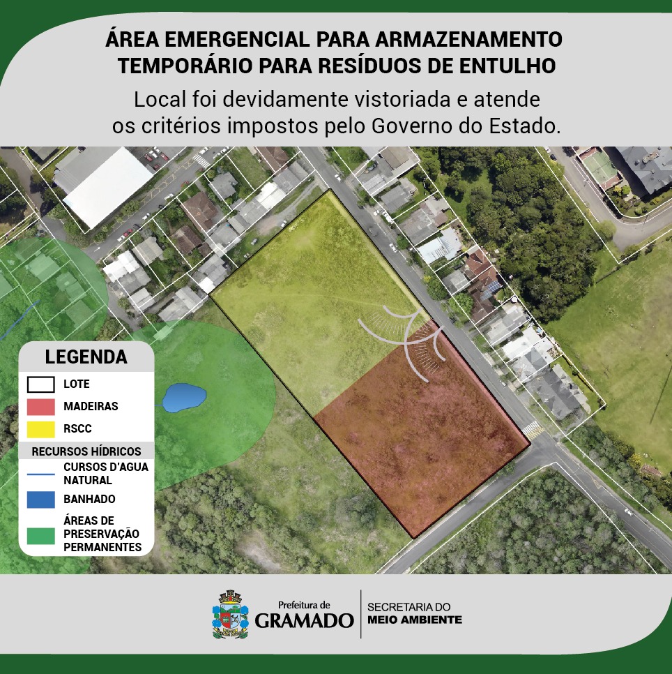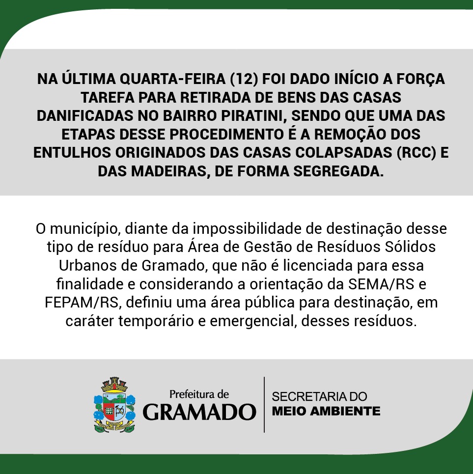 Diante da impossibilidade de destinação desse tipo de resíduo para a Área de Gestão de Resíduos Sólidos Urbanos de Gramado, que não é licenciada para essa finalidade, a Secretaria do Meio Ambiente acatou uma orientação da Secretaria Estadual do Meio Ambiente e da FEPAM/RS, que autoriza a possibilidade, em caráter emergencial, para armazenamento temporário esses resíduos em áreas específicas, seguindo critérios técnicos.