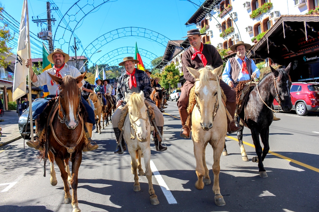 O chefe de Gabinete do Prefeito, Renato Bertoja, o secretário da Cultura, Allan John Lino, o adjunto da Cultura, Milton Ramisch, e o deputado federal Pompeo de Mattos, acompanharam o movimento em Gramado a cavalo.