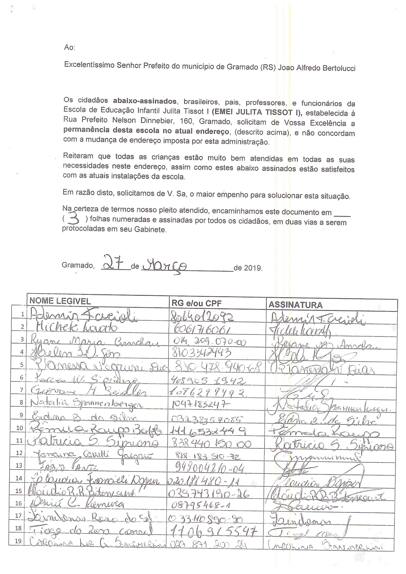 Um abaixo assinado dos pais também foi entregue e enviado juntamente com esse pedido ao Executivo.