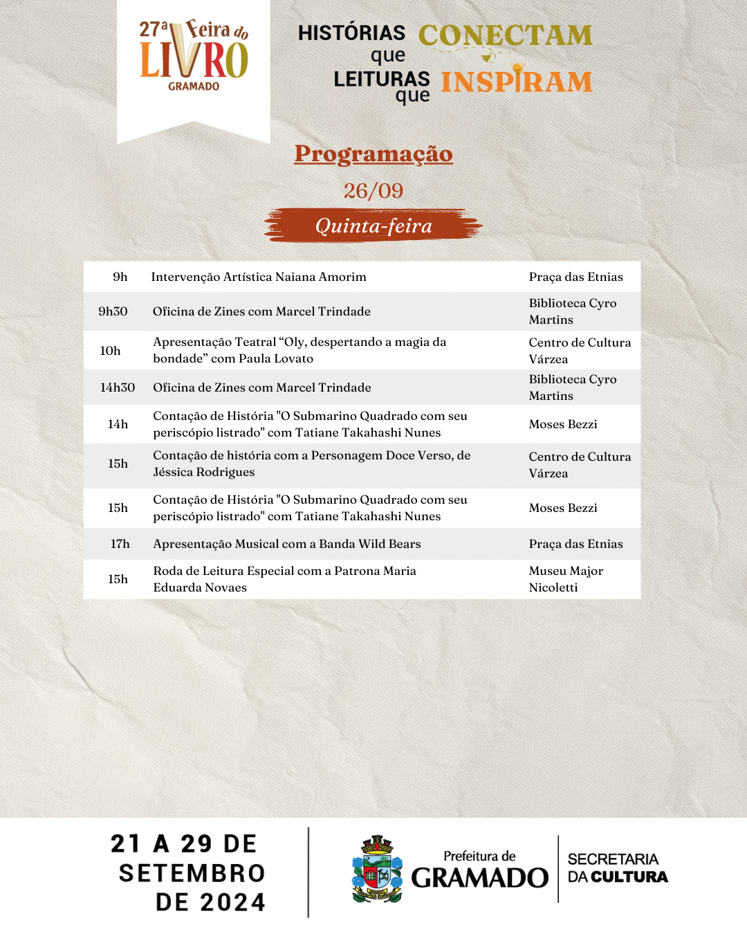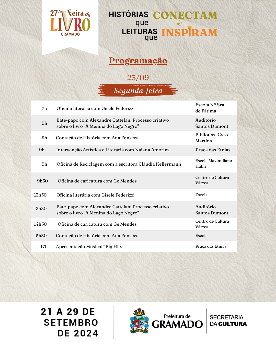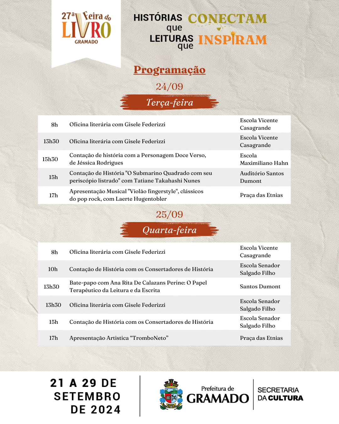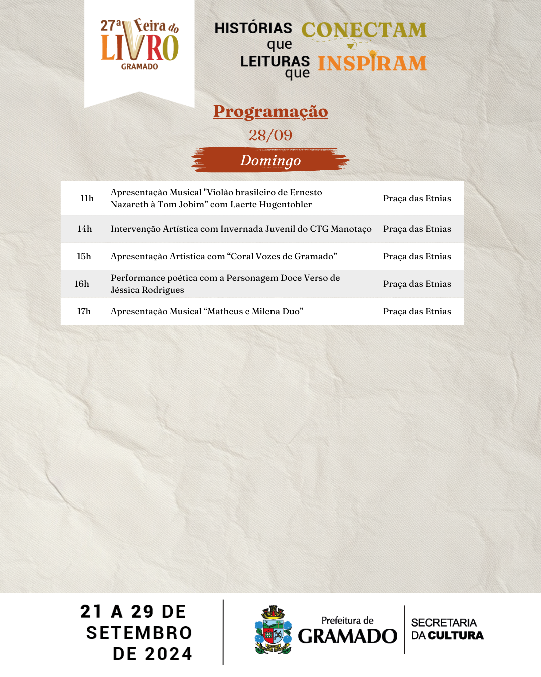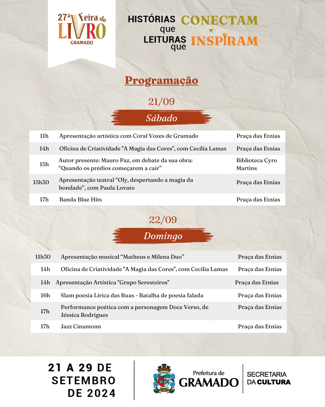 Leitura é o alimento da alma, e com o tema “Histórias que conectam, leituras que inspiram”, a 27ª Edição da Feira do Livro de Gramado, realizada pela Secretaria da Cultura, inicia neste sábado (21) e terá como palco a Praça das Etnias. Além das tradicionais bancas de vendas de livros, o evento conta com ampla programação artística e cultural gratuita.