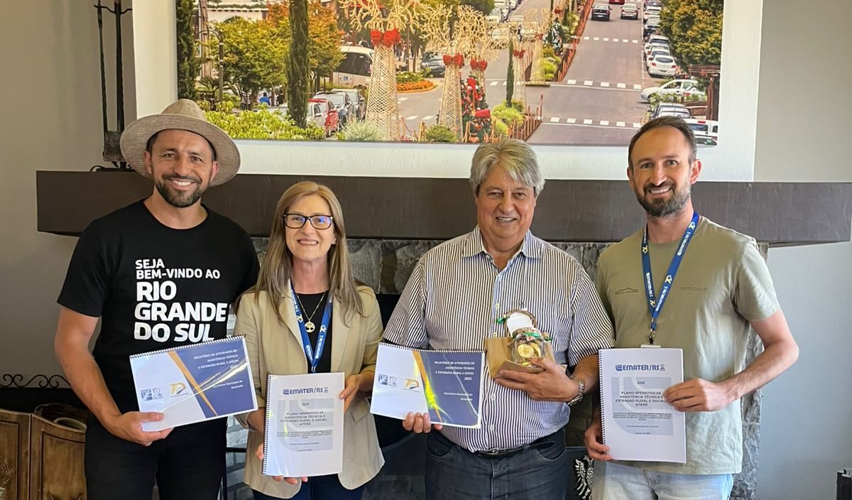 Na tarde desta quarta-feira (17), a Emater de Gramado entregou ao prefeito Nestor Tissot e ao secretário da Agricultura, Eliezer Lima, o relatório com as ações realizadas em 2025, bem como o planejamento para o ano de 2026. Ao todo, mais de 470 famílias foram atendidas nas diversas frentes de atuação desenvolvidas no município, reforçando o papel da Emater como parceira fundamental do setor agrícola.