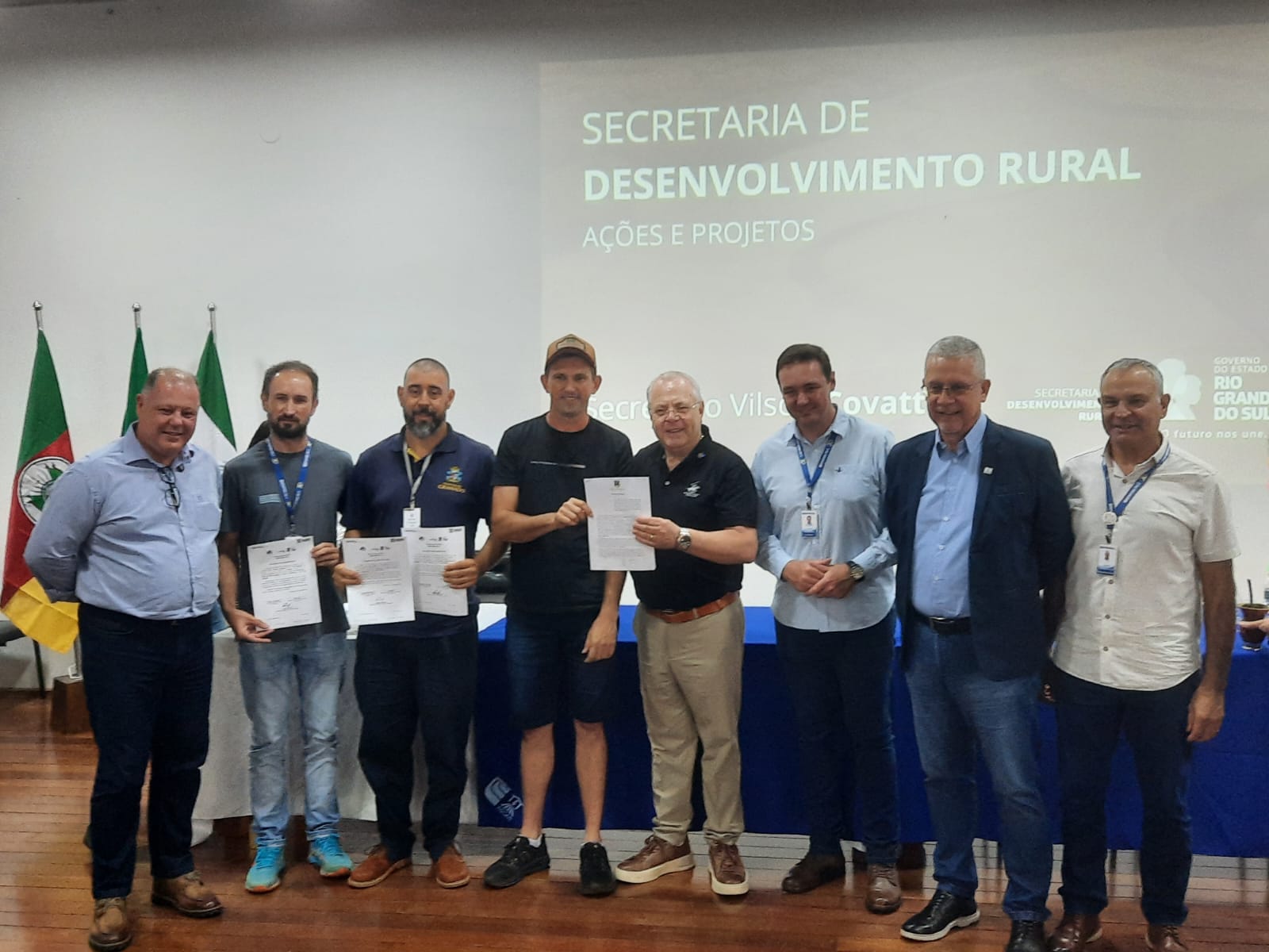 A Prefeitura de Gramado, por meio da Secretaria da Agricultura, participou nesta segunda-feira (05) do ato de assinatura do Plano Safra RS – Bônus Mais Leite e do Projeto de Fomento Produtivo às Associações e Cooperativas, realizado em Veranópolis e promovido pela Secretaria de Desenvolvimento Rural do Estado. Representando o município, o servidor Juliano Teixeira esteve no evento, que também contou com a presença do secretário estadual Vilson Covatti. No total, quatro produtores rurais e uma associação de Gramado foram contemplados com recursos que visam fortalecer a produção leiteira e fomentar o desenvolvimento do interior.