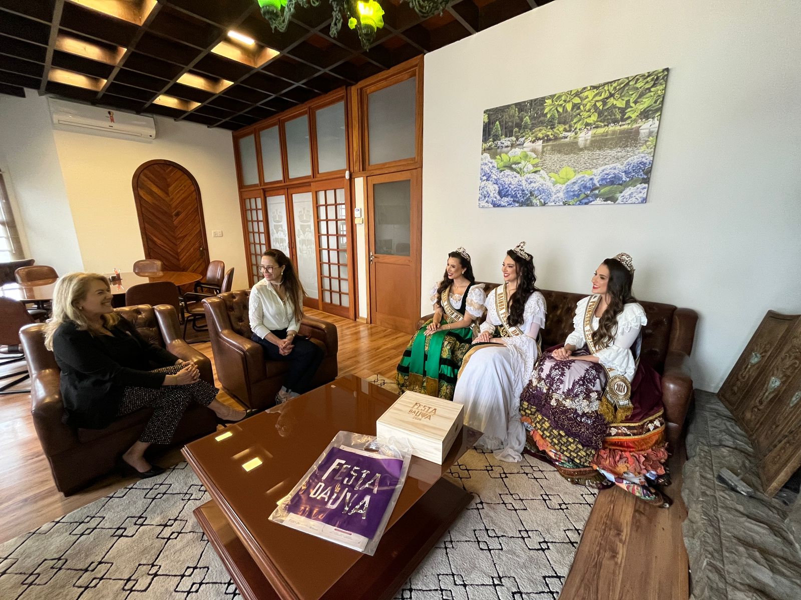 Nesta terça-feira (14), as soberanas da Festa da Uva e a vice-prefeita de Caxias do Sul, Paula Ioris, visitaram a Prefeitura de Gramado para divulgar o evento que acontece de 15 de fevereiro a 3 de março de 2024. A corte foi recebida pela secretária adjunta do Turismo de Gramado, Vera Simão.